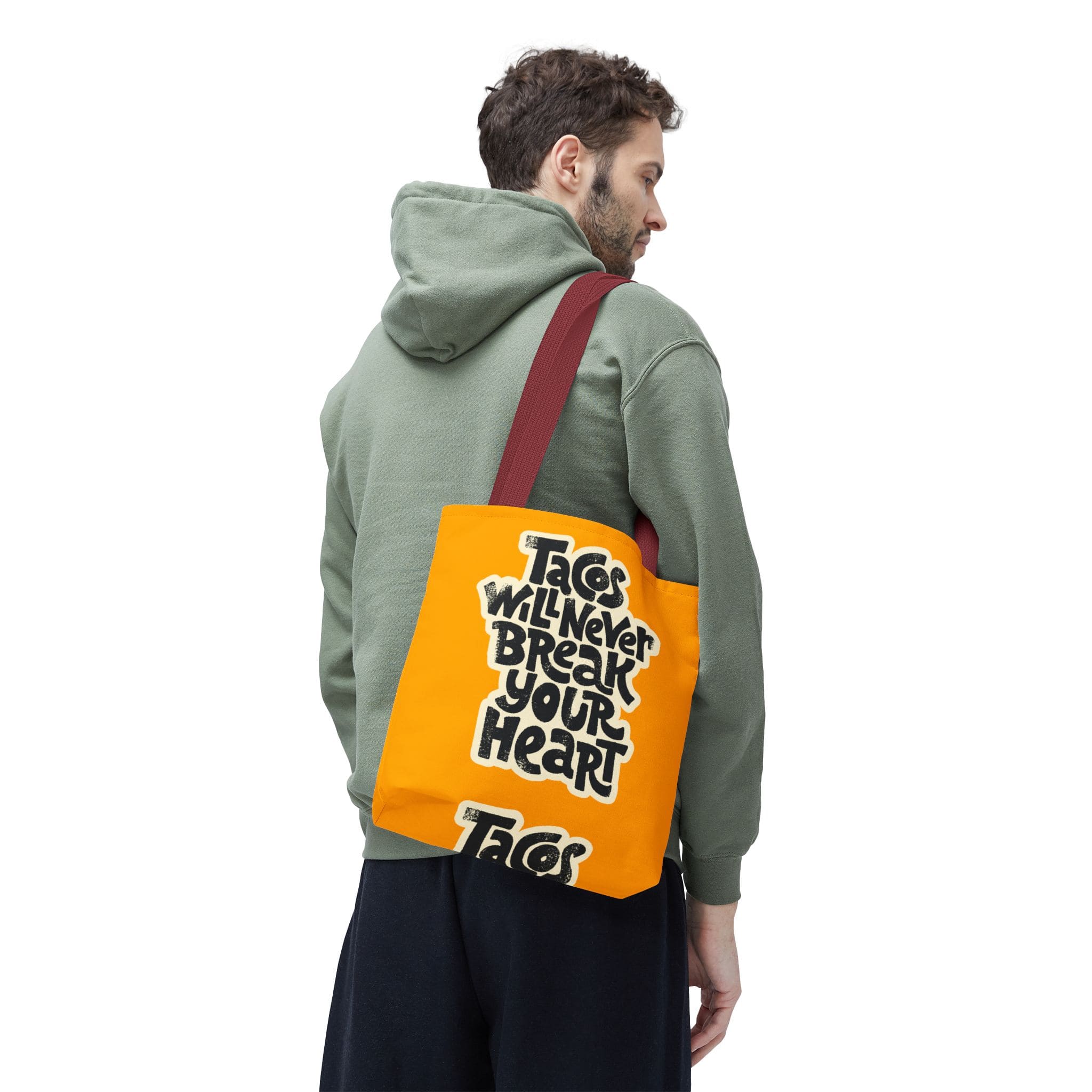 The Tacos Will Never Break Your Heart Bold Yellow Tote Bag from NessBoutiqueArt features a food-themed printed quote on a bright yellow background. The design is suitable for casual daily use.